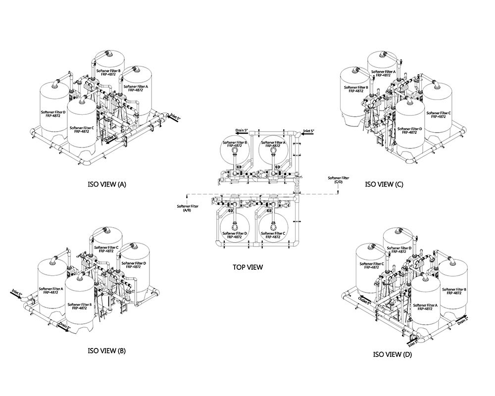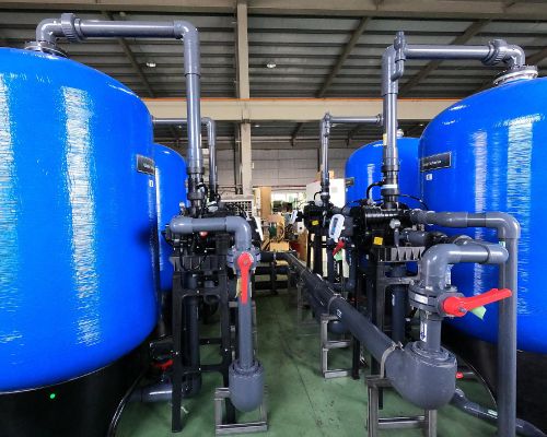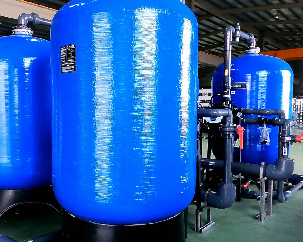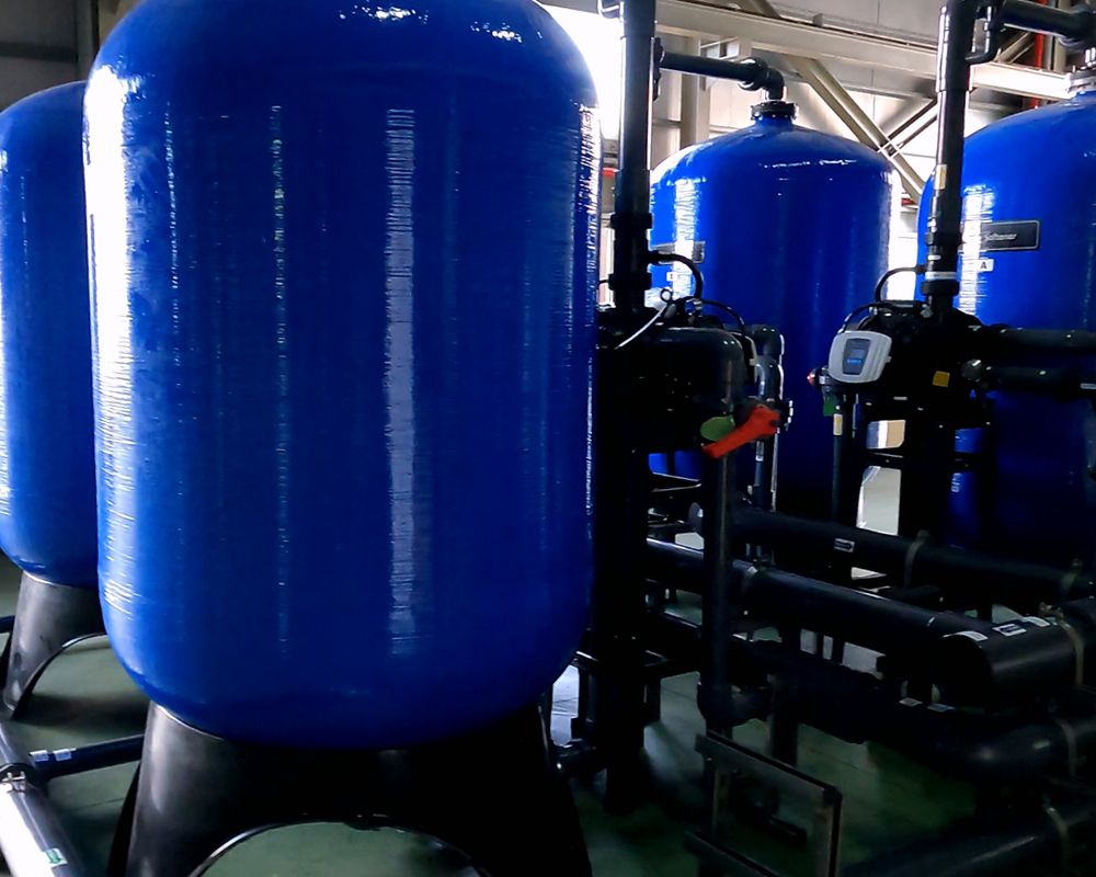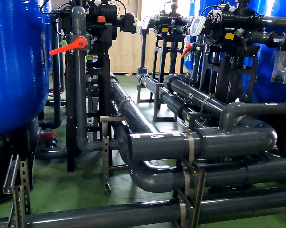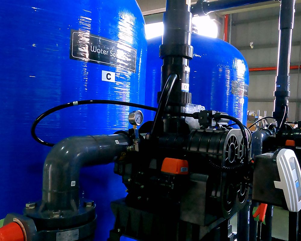 FRP 63"x86" 罐體4組並聯,填充 ROTEK 鈉型陽離子樹脂(3,000L/罐),採用RUNXIN流量型- 40m³/h自動控制閥組,每日再生循環,平均鹽耗約 1120Kg