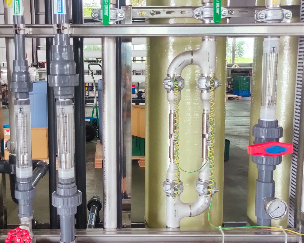 本專案為德國基地防疫口罩(熔噴不織布)生產線量身打造,解決其製程中對高純度製程用水的需求。由於熔噴布生產對水質純度要求極高,本案採用逆滲透(RO)搭配DI混床(Mixed Bed)設計,最終產出水質達 8MΩ以上電阻率,符合電子級與醫療製程標準。