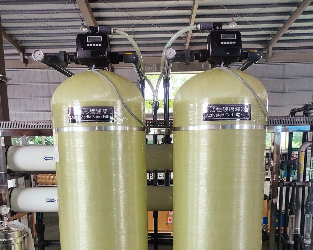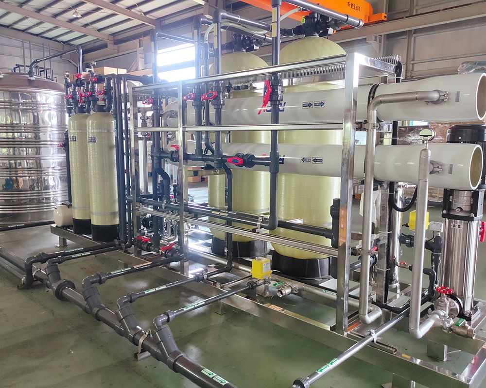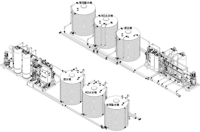 原水供應 ⮕ 原水桶(5,000L)⮕ STAIRS 原水泵浦 ⮕ 不鏽鋼除垢器(雙組並聯)⮕ 自動砂濾器 ⮕ 自動活性碳濾器 ⮕ 精密過濾器 ⮕ RO 主機 ⮕ RO 儲水桶 ⮕ RO 後段加壓泵浦 ⮕ DI混床(雙塔)⮕ 精密過濾器 ⮕ 使用點水塔 ⮕ 使用點泵浦 ⮕ 熔噴布產線 ⮕ 回水系統