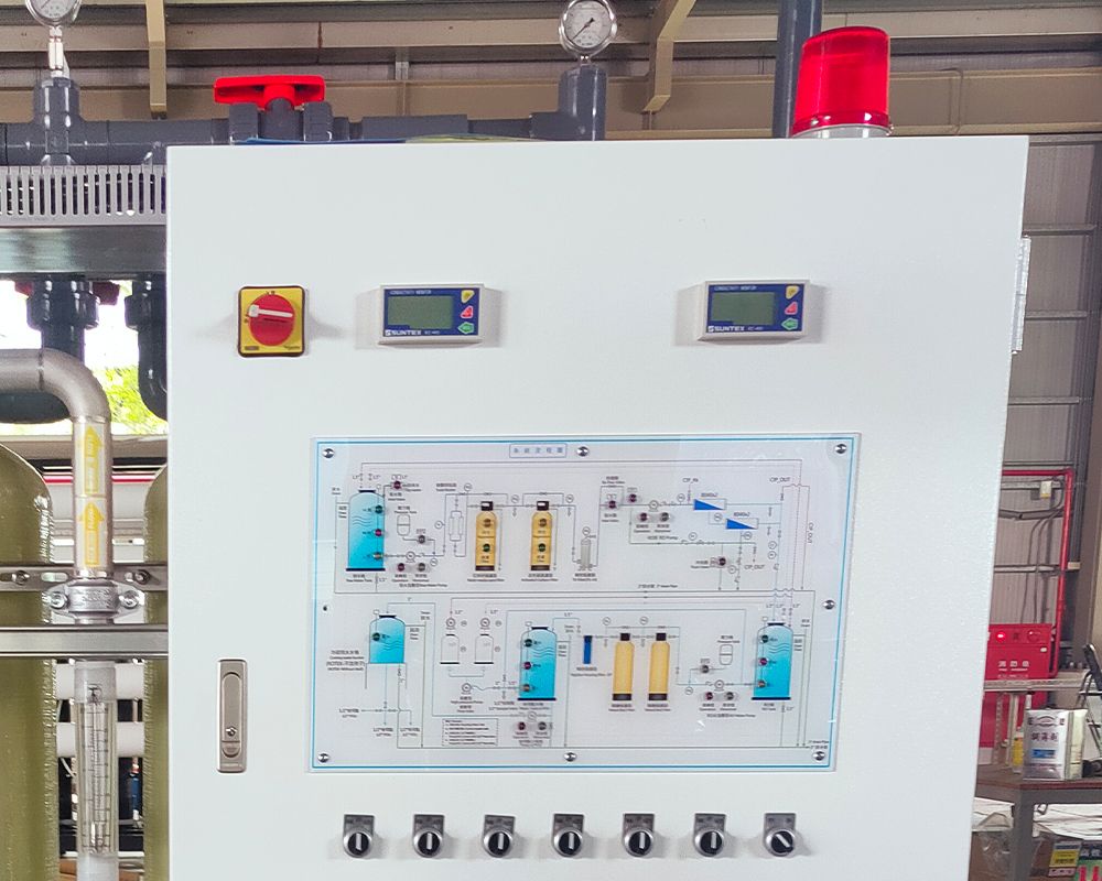 本專案為德國防疫口罩(熔噴不織布)生產線設計之高純度製程用水系統,採用4.2T/H逆滲透(RO)搭配DI混床,產出水質達8MΩ以上,符合電子級與醫療級標準。系統包含不鏽鋼前處理、自動砂碳過濾、雙塔混床、精密過濾及智慧控制,搭配德英雙語介面與遠端監控,有效確保供水穩定並降低人力維護。全系統通過CE、NSF、CSA等國際認證,具高擴展性與模組化設計,適用電子、醫療、半導體等產業。此案為台灣精密水處理設備成功打入國際市場之代表案例。