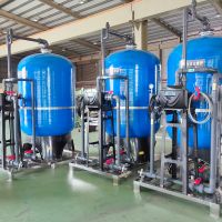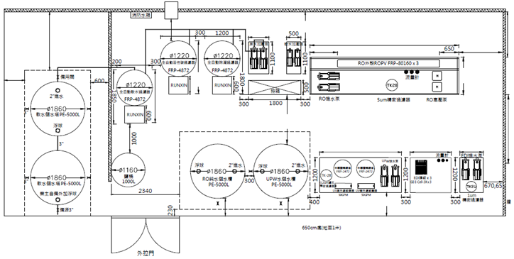 原水加壓馬達→全自動多層除濁過濾器→全自動活性碳過濾器→全自動軟化過濾器→軟水儲水塔→軟水加壓泵。功能 : 去除水中的懸浮物和有機物及鈣、鎂離子,防止結垢。