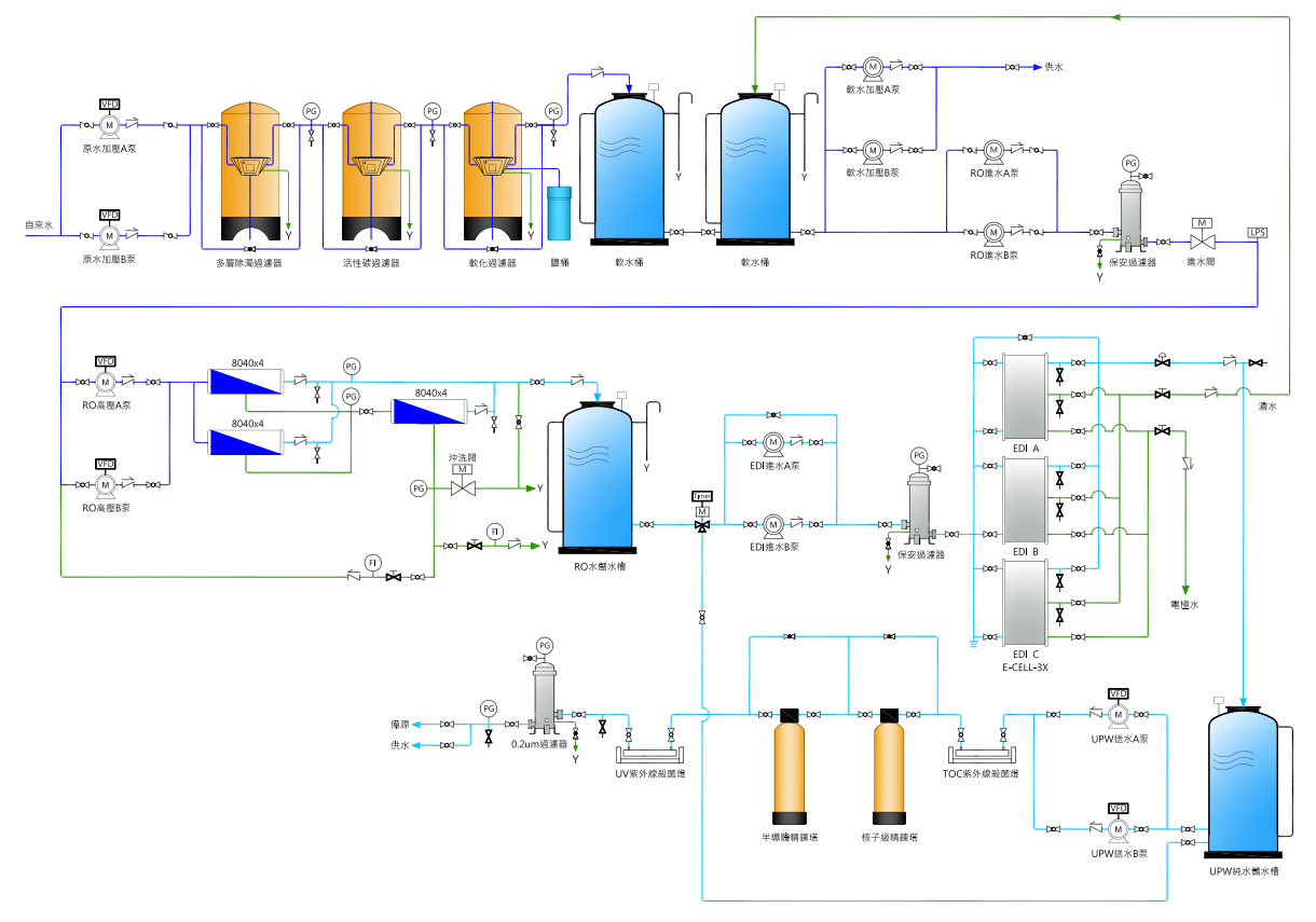 EDI進水泵→1μm精密過濾器→EDI系統→UPW純水儲水槽→UPW送水泵→核子級精煉塔→TOC紫外線殺菌器→半導體精煉塔→UV紫外線殺菌器→0.2μm精密過濾器功能 : 結合電滲析和離子交換技術,進一步去除水中的離子,使水質達到電阻率10 MΩ·cm以上的超純水標準,並通過紫外線照射,殺滅水中的微生物,防止生物污染。