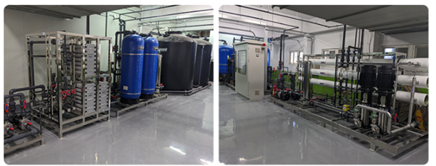 RO進水泵→5μm精密過濾器→RO高壓泵→RO逆滲透系統主機→RO水儲水槽。功能 : 去除水中的溶解鹽和有機物,產水電導率降至10 µS/cm以下。
